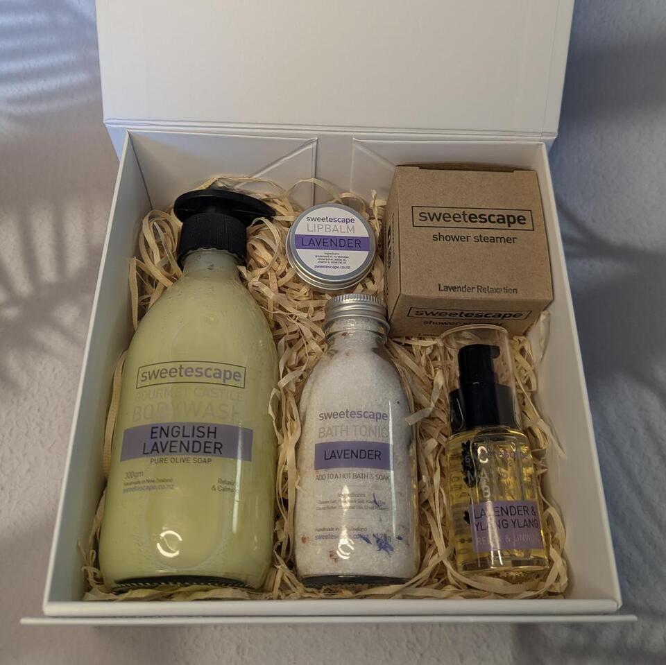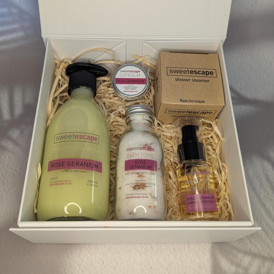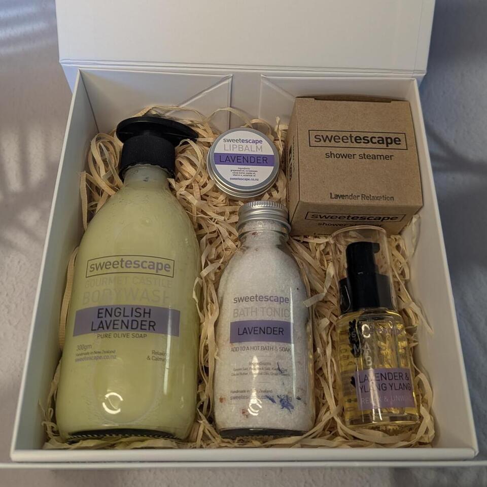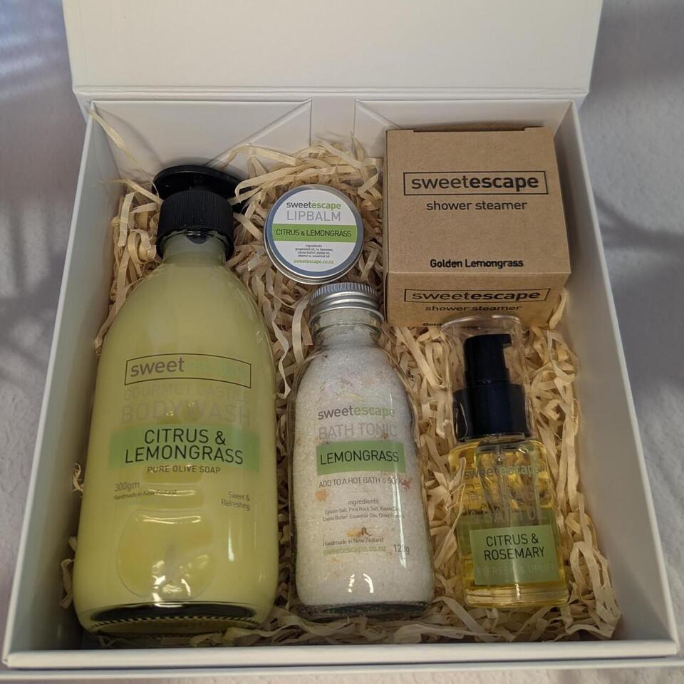 Contains Bodywash, 120g bath tonic, lip balm, shower steamer, and a massage and bath oil.