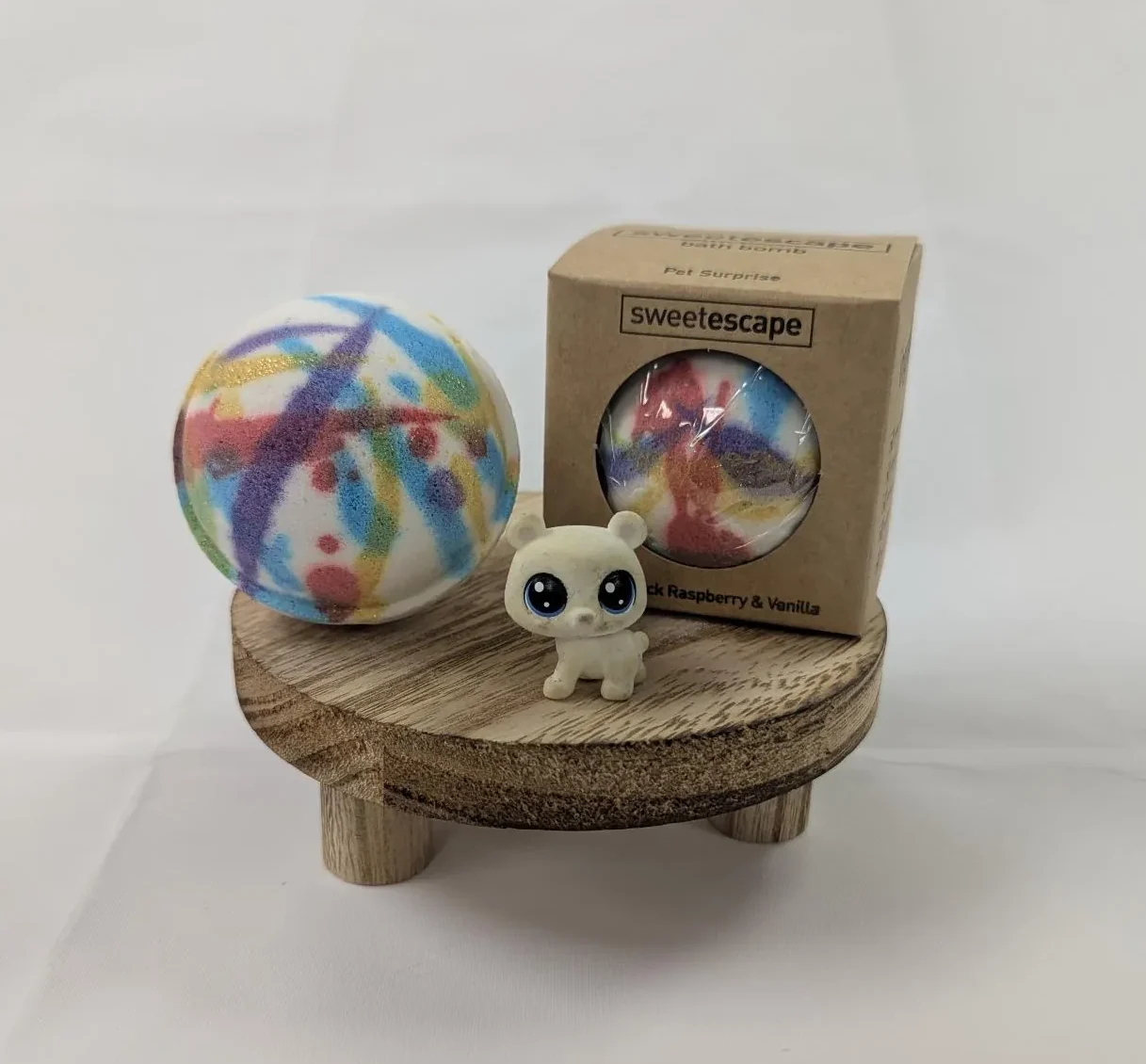 Our Sweet Escape handmade Pet Surprise bath bombs each contain an adorable pet mini figure, and look and smell absolutely amazing! Each bomb weighs 115g approx and is guaranteed to fizz away perfectly! Perfect for an indulgent deep bath, individually wrapped in compostable and biodegradable cello wrap. With Cocoa Butter to soften & nourish your skin.