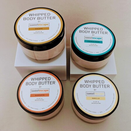 Mandarin - Ingredients: Shea butter, cocoa butter, almond oil, grapeseed oil, coconut oil, BTMS50, cetyl alcohol, essential oil, tapioca starch, mica